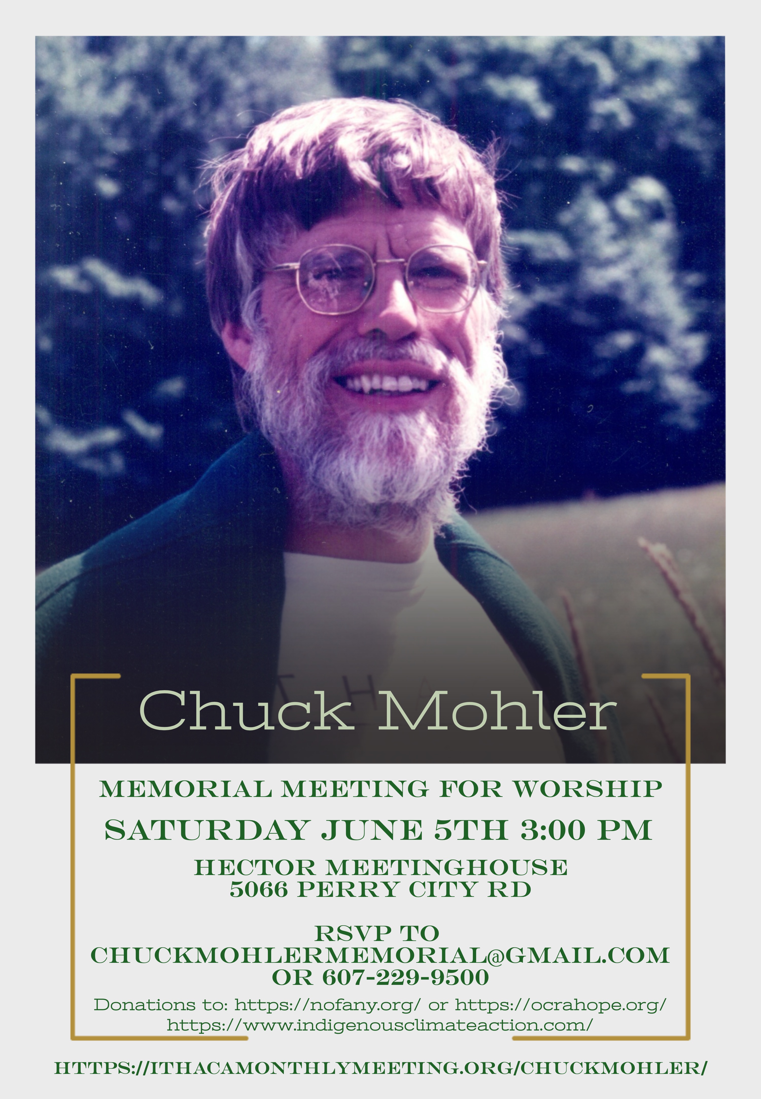 A Memorial Meeting for Worship for Charles Leon Mohler was held on Saturday, June 5 2021 at Ithaca Meeting’s Hector Meetinghouse. A second, online Memorial Meeting for Worship will be held via Zoom on Wednesday, June 16, 2021 beginning at 7pm. The Memorial Meeting will be in the Quaker tradition of silent worship with friends and family rising, or unmuting their microphone, to speak “as led”. At a memorial meeting “attention is focused . . . on a living spirit and a radiant faith.”